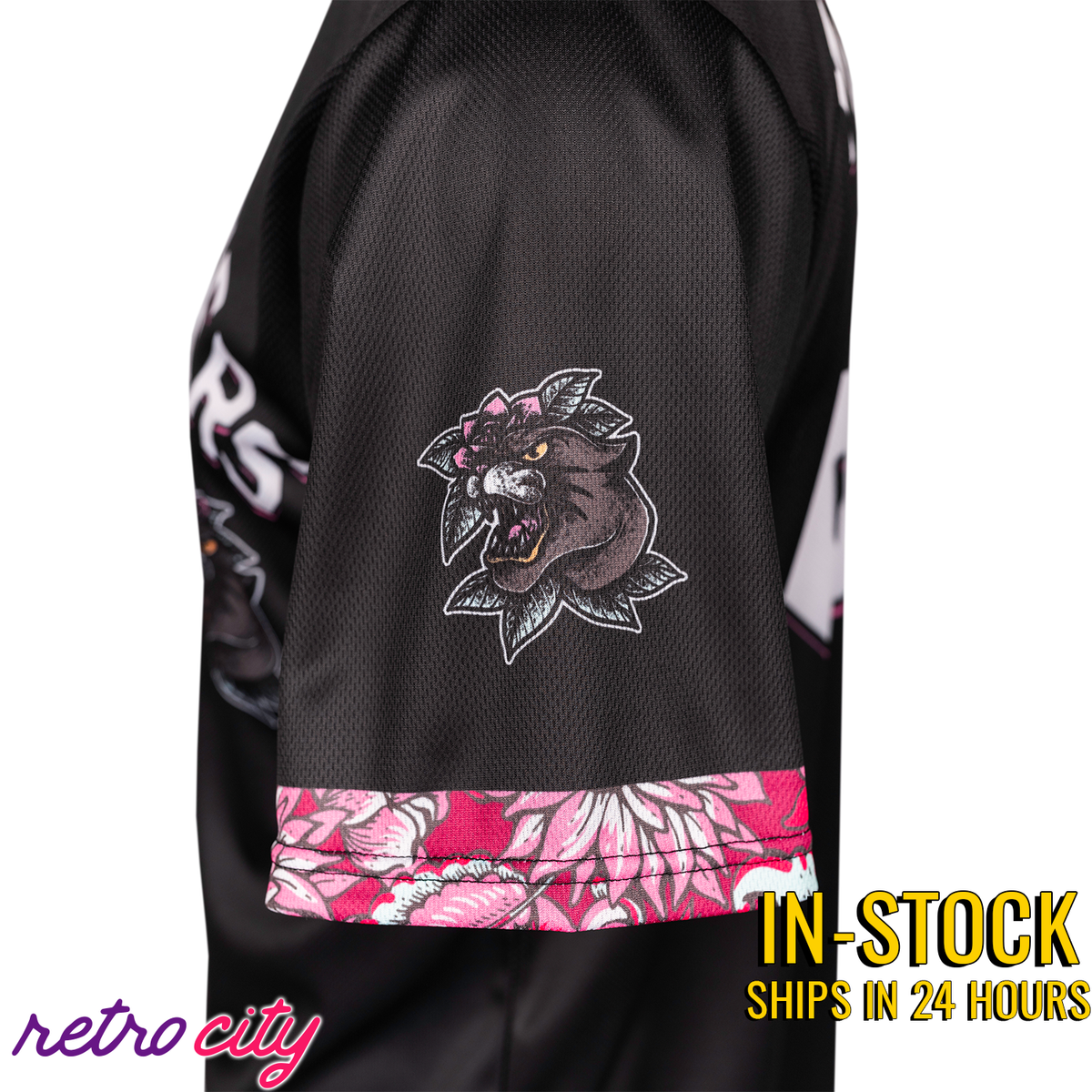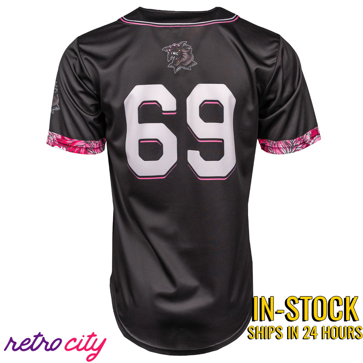 This custom full-button baseball jersey features a black base color with pink/cream piping and text and a very sex panther-ish floral sleeve pattern. It also features a Sex Panther - whatever that is - and the #69.