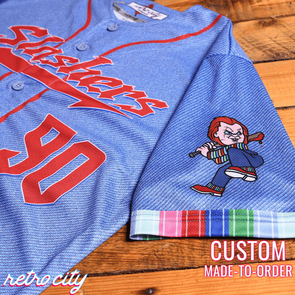 This custom full-button baseball jersey features a base faux-denim pattern, red/white/blue text, Chucky's 'Good Guys' pattern on the inside button placket, and the Chucky Slasher Series logo on the left sleeve.