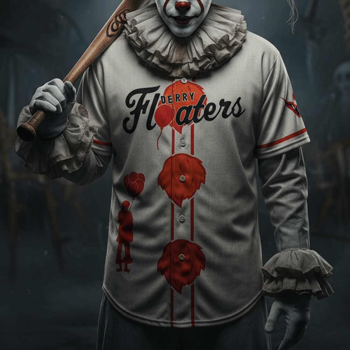 Our Derry Floaters Baseball Jersey combines small-town team spirit with sinister Pennywise flair — perfect for horror fans who like their drip a little deadly. Featuring bold “Derry Floaters” script and creepy-cool clown details, it’s game day meets doomsday in one killer fit.