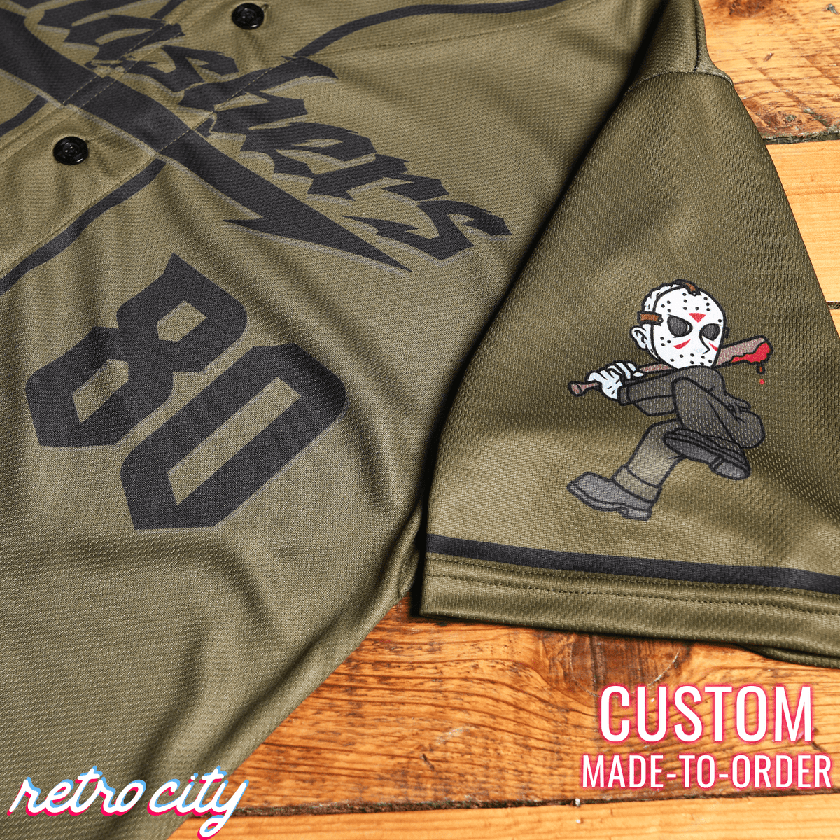 This custom full-button baseball jersey features an army green base color, black text and piping, and the Jason Slasher Series logo on the left sleeve.