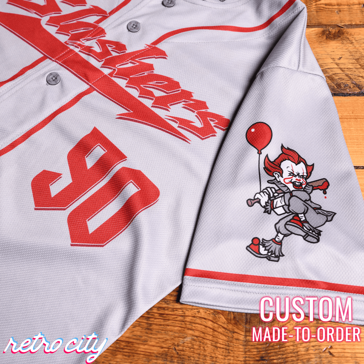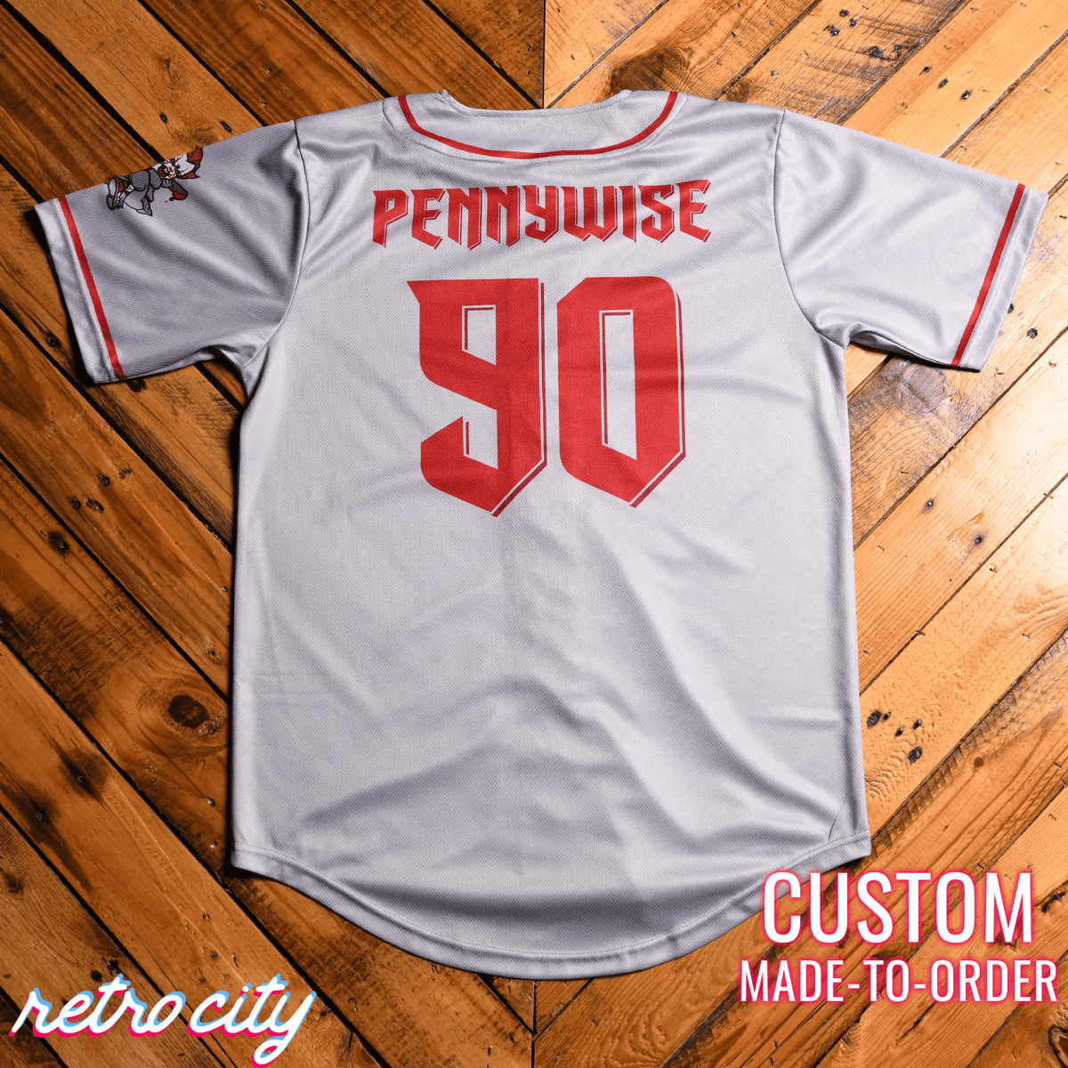This custom full-button baseball jersey features a silver base color, red text and piping, and the Pennywise Slasher Series logo on the left sleeve.
