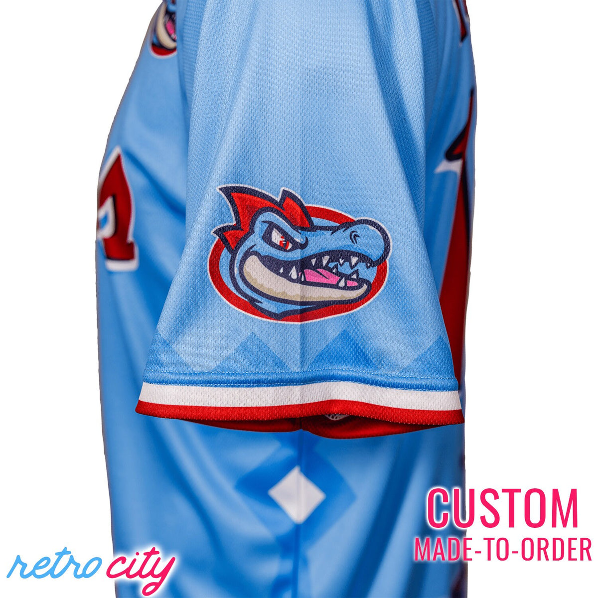 This full-button baseball jersey is custom-made to order with whatever name or number you want! It features a columbia blue base color with dark columbia "teeth" marks, red and white stripes, the Gatrs logo on the front and left sleeve, and front Japanese text that translates to 'Feraligatr'.