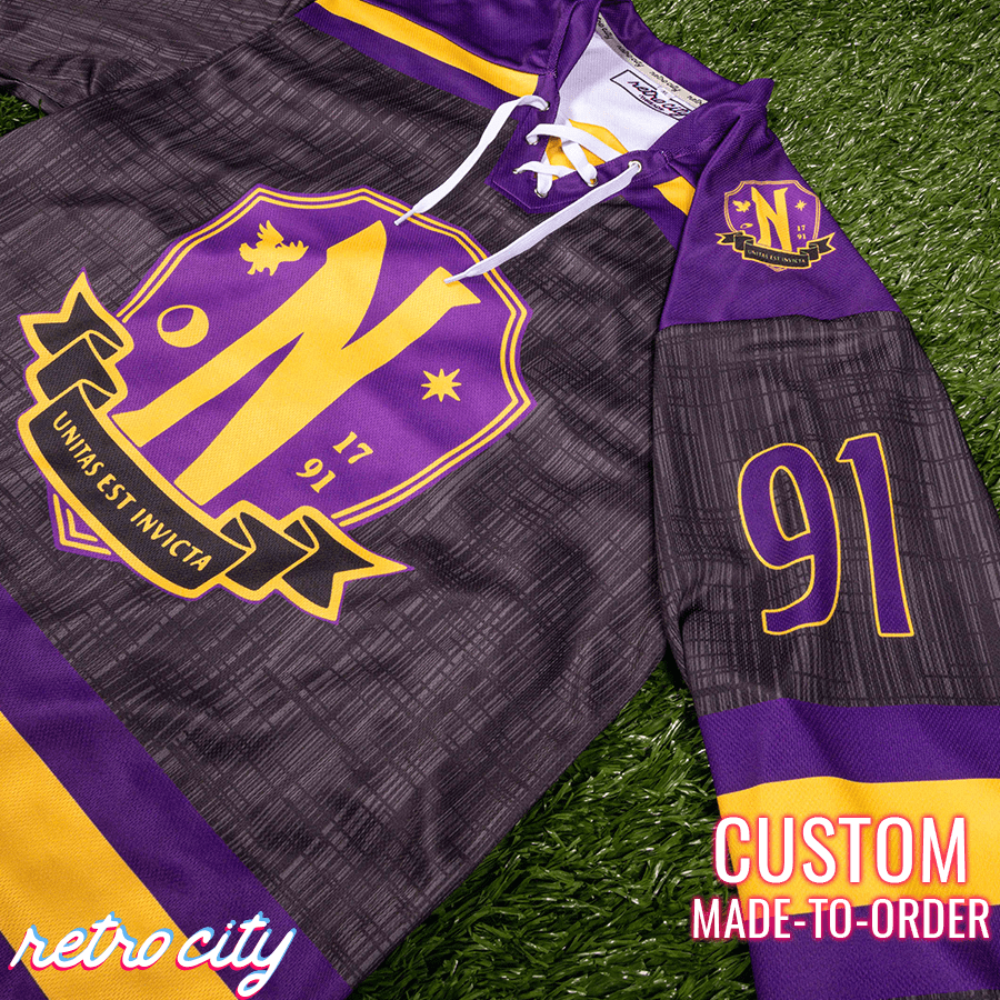 This custom lace-up hockey sweater is perfect for all Nevermore Academy fans (and students)!
