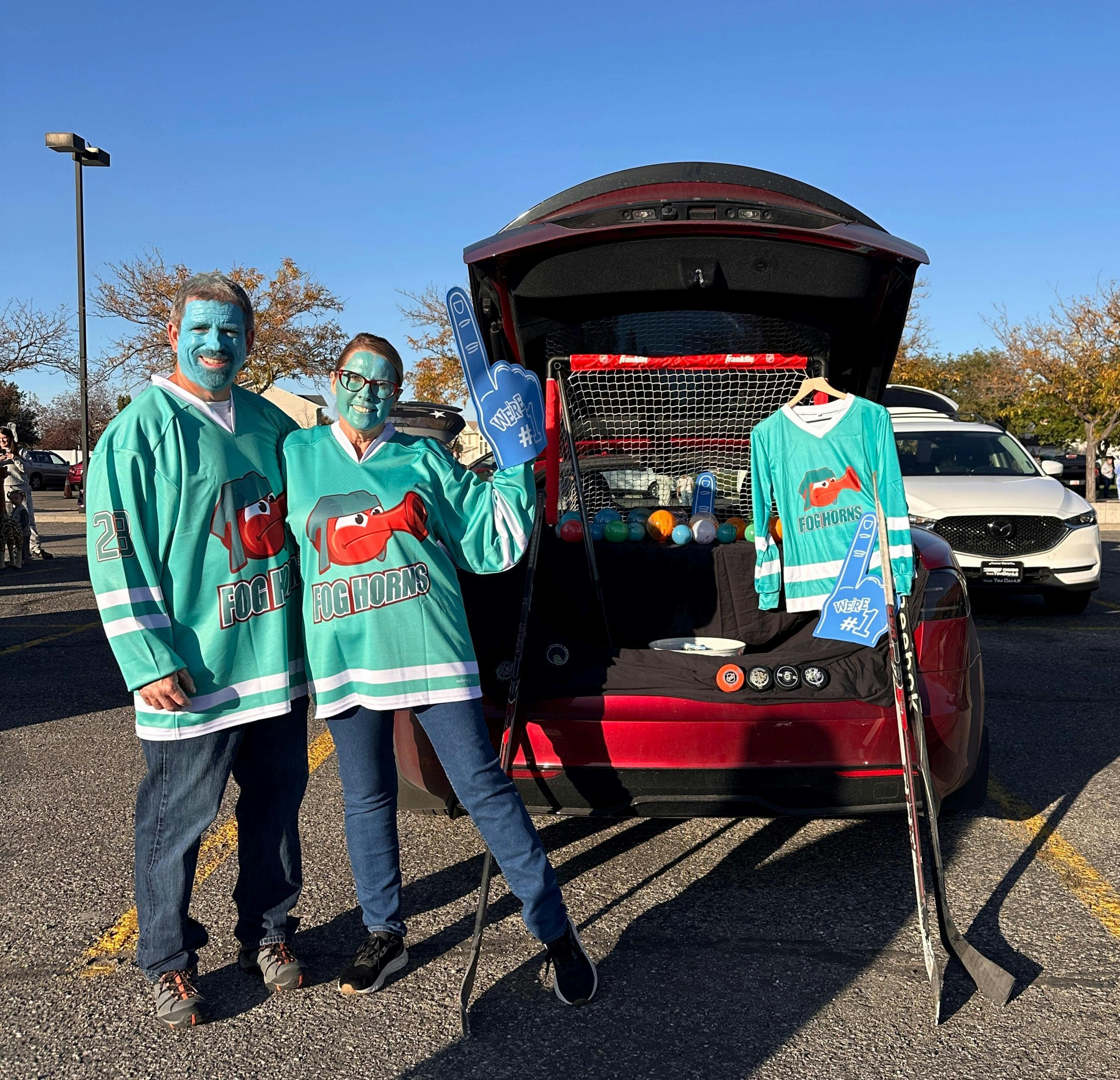 This custom hockey jersey features Paz Vizsla's helmet on the front with a Clan Mudhorn logo pattern set behind the helmet within the shield, a Mythosaur logo pattern set within the columbia-blue stripes on the sleeves, Paz's helmet and heavy blaster cannon logo on both shoulders, sleeve numbers, and a loose translation of "This is the way" in the Aurebesh language on the bottom-back.