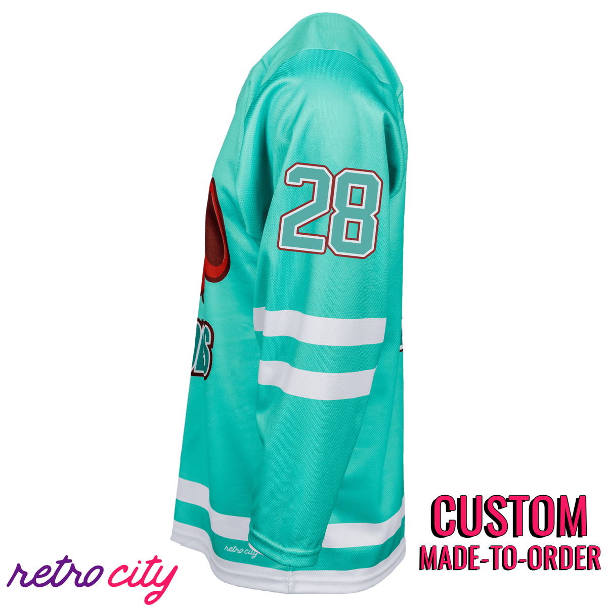 This hockey jersey is custom-made to order with whatever name or number you want! It features a Seamfoam Green base color, white stripes, and the Fog Horn logo on the front and above the back number.